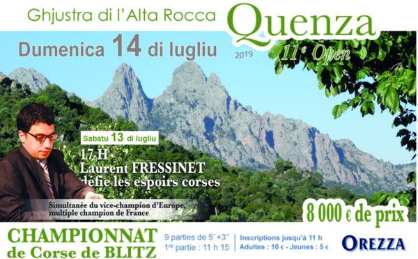 Le championnat de Core de Blitz aura lieu dans le magnifique village de Quenza, ce dimanche 14 juillet 2019. Cette compétition populaire est dotée de 8 000 € de prix. L'Open de Blitz se déroulera le dimanche 14 juillet et comprendra 9 rondes de 5 mn +3s. Le...