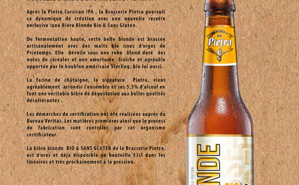 La Brasserie Pietra a partagé son savoir-faire pour mettre au point une nouvelle bière blonde, bio et sans gluten... Après la Pietra Corsican Ipa, la Brasserie Pietra poursuit sa dynamique de création avec une nouvelle recette exclusive :une Bière Blonde Bio...