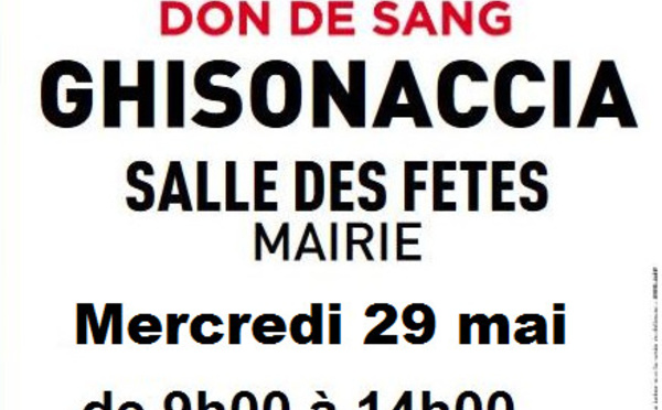 La prochaine collecte de sang de l’EFS est programmée Mercredi 29 mai de 9h00 à 14h00 à la salle des fêtes de la mairie de Ghisonaccia. « A cette occasion nous aurons avec nous la présence de "LA ROSE DU MAQUIS" entreprise spécialisée dans la fabrication de...