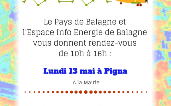 Le Pays de Balagne et l'Espace Info Energie de Balagne vous donne rendez-vous le lundi 13 mai, de 10 heures à 16 heures à la mairie de Pigna ou se tiendra une permanence. Grâce à l'opération de thermographie aérienne réalisée en Balagne nous interpréterons...