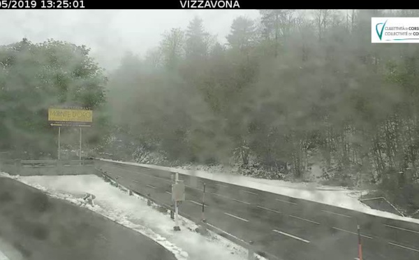 De la neige est tombée en ce dimanche 5 mai sur les hauteurs de l'île comme ici au col de Vizzavona, comme on peut le constater sur l'image de la webcam de la Collectivité de Corse. Le temps a été très capricieux ce dimanche en Corse. Vents, pluies et neige...