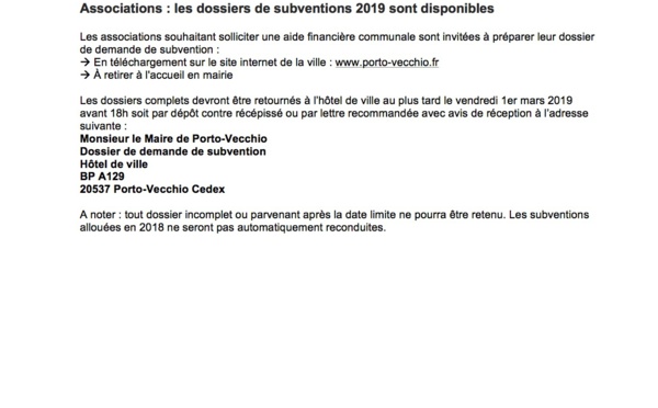 La Mairie de Porto Vecchio informe que les associations souhaitant solliciter une aide financière communale sont invitées à préparer leur dossier. Les associations souhaitant solliciter une aide financière communale sont invitées à préparer leur dossier: En...