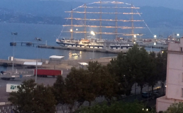 Sur les eaux calmes du port d'Ajaccio, le Star Clipper...