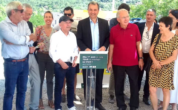"En Corse, depuis le 1er Août tous les emballages se trient" : Francois Tatti , Président du Syvadec Antoine Sindali, maire de Corte et Xavier Poli, président de la Communauté de Communes du Centre Corse, ont ont procédé mercredi matin à Corte, au lancement...
