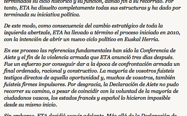 Le mouvement indépendantiste basque a annoncé sa dissolution définitive, après des décennies d'actions violentes qui ont fait plus de 800 morts Une simple lettre publiée en ce début du mois de mai dans un journal en ligne : l'organisation séparatiste...