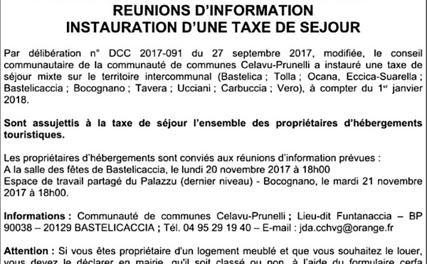 Le conseil communautaire de la communauté des communes du Celavu-Mezzana a instauré le 27 Septembre dernier une taxe de séjour mixte sur son territoire à laquelle sont assujettis l'ensemble des propriétaires d'hébergements touristiques. Des réunions...