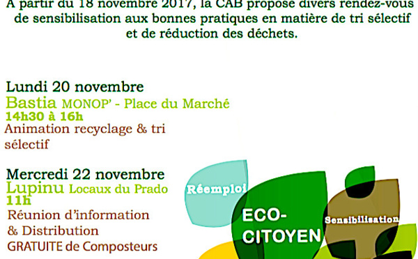 A l’occasion de la Semaine Européenne de Réduction des Déchets qui a débuté samedi, la Communauté d'agglomération de Bastia proposera divers rendez-vous de sensibilisation aux bonnes pratiques en matière de tri sélectif et de réduction des déchets, à...