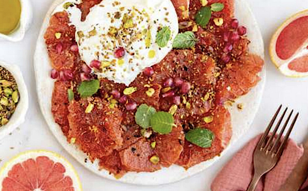 À table - Carpaccio de Pomelo de Corse rôti, burrata & dukkah
