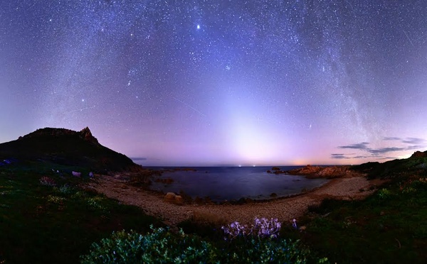 "Je suis allé sur le sentier des douaniers, à Ajaccio, après le coucher du soleil photographier la lumière zodiacale, visible à cette période. C'est une émanation lumineuse intense qui remonte de l'horizon. Voilà un beau paysage de l'ouest, avec la Voie...