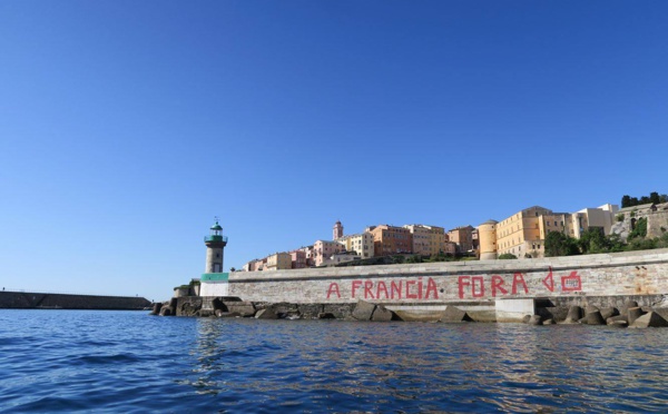 "A Francia Fora" : Une large et grande inscription en lettre rouges avec en bout de ligne un dessin, aussi explicite que le message que l'on a voulu faire passer, s'est affiché il y a quelques jours sur la jetée du port de commerce du vieux-port de Bastia que...