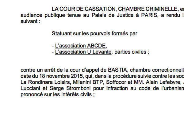 Dans un communiqué U Levante, association agréée de protection de l'environnement de la Corse, souligne que "La Chambre criminelle de la Cour de cassation a, ce jour, donné raison au pourvoi des associations U Levante et ABCDE." "En 2010, les sociétés «...