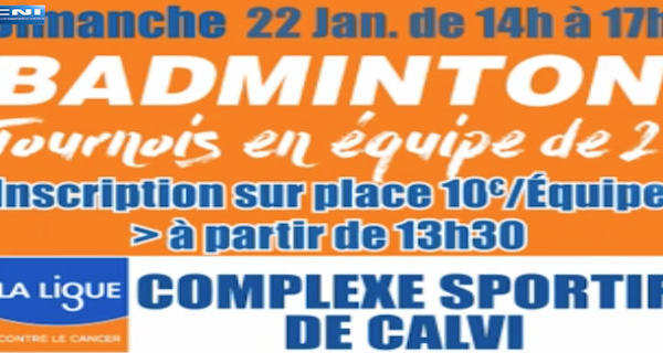 L'antenne Balagne de la Ligue contre le cancer, le complexe sportive Calvi-Balagne et le club de Badminton ont unis leurs efforts pour proposer un tournoi de badminton par équipes de deux qui aura lieu le dimanche 22 janvier 2017, de 14 heures à 17 heures au...