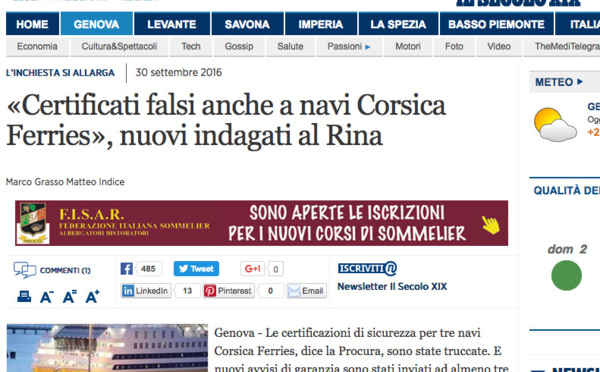 Les certificats de sécurité concernant trois navires de Corsica Ferries auraient été "truqués" par des employés du Rina (Registre italien Naval), qui font, aujourd'hui, l'objet d'une enquête poussée de la part du parquet de Gênes pour "faux en actes publics"....
