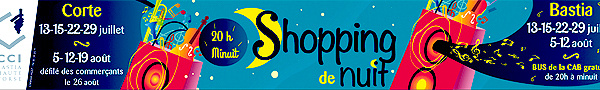 La CCI et ses partenaires informent que : le "Shopping de Nuit" annulé vendredi dernier aura lieu ce mercredi 20 juillet. Animation à partir de 20h30 dans tout le centre-ville de Bastia, boutiques ouvertes jusqu’à minuit et bus gratuits.