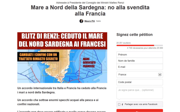 Déjà vingt mille signatures pour la pétition lancée sur le site www.change.org par le député sarde Mauro Pili qui demande au gouvernement italien d’annuler l’accord bilatéral franco-italien de Caen sur le redécoupage des frontières maritimes Que la France et...