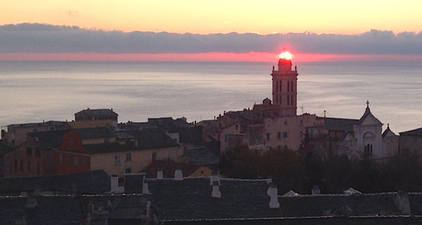 Bastia : Le soleil comme un point sur i sur le clocher de Sainte-Marie
