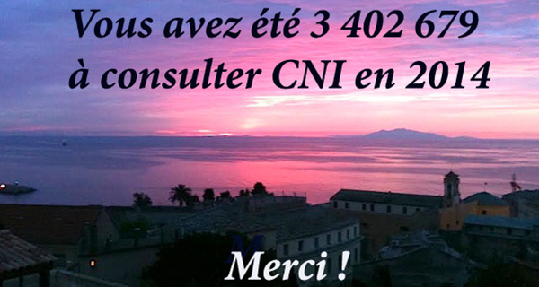 2014 a vécu. 2015 débute. Corse Net Infos, trois ans et demi après son lancement, est toujours là. Avec, encore, au cours des 12 derniers mois une progression de son audience de près de 50% ! Notre objectif, au cours des 12 mois à venir, sera faire mieux....
