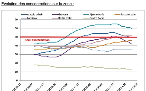 Dans un communiqué l'association Qualit'air Corse souligne que les niveaux de concentration en particules fines sont supérieures à à 50 µg/m3 sur 24 heures glissantes. Dès lors la procédure d'information et de recommandation du public est maintenue jusqu'à...