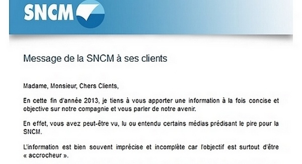 La prise de parole du directeur commercial de la SNCM Pierre Marcy, prend la forme d’une lettre adressée directement aux clients, signée de sa main et envoyée par mail. Le courriel a été reçu par plusieurs dizaines de milliers de clients de la SNCM...