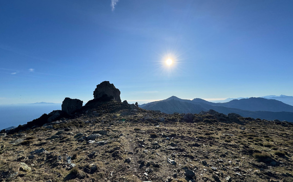 Sur le chemin des crêtes du Cap Corse, par une belle matinée de décembre, en direction de la Cima di è Follice, son point point culminant, rencontre de deux silhouettes familières, À Cipolla (rocher du Pruberzulu) et son acolyte l’Agliu ! Au second plan,...