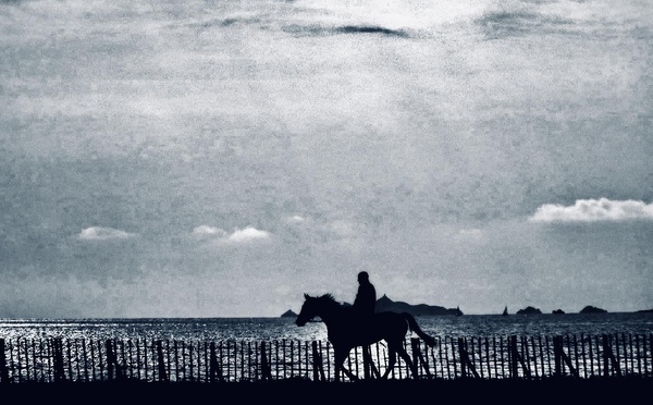 Quelques rayons lumineux percent la couverture nuageuse. La mer est d'argent. En ombres chinoises, les Sanguinaires et sur la grève du Ricantu, un cheval et un homme en balade. Une image dominée certes par le gris, mais dans laquelle la beauté est quand même...
