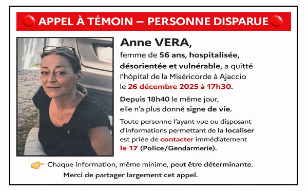 Un appel à témoins a été lancé ce samedi 27 décembre, après la disparition d’Anne Vera, une femme de 56 ans, hospitalisée à l’hôpital de la Miséricorde à Ajaccio. Selon les informations communiquées, elle a quitté l’établissement le jeudi 26 décembre 2025 aux...