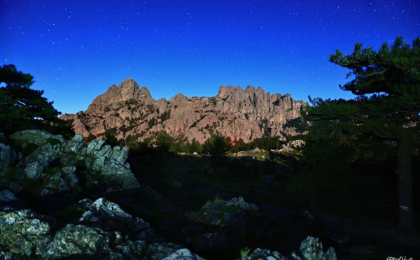 "Tard dans la nuit, quand le ciel est bien étoilé, la lune décroissante se lève et éclaire le massif de Bavella, photographié ici derrière un sentier sur le chemin du Gr20. Les pins Laricio bordent cette promenade à la lampe frontale..." nous écrit Patrick...
