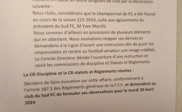 Dans un procès-verbal en date du 25 avril dernier, émanant des Commissions Régionales de Discipline et des Statuts et Règlements de la Ligue Corse de Football, est mentionnée une suspicion de fraude dans le championnat de Régional 1 par le club du Sud FC,...
