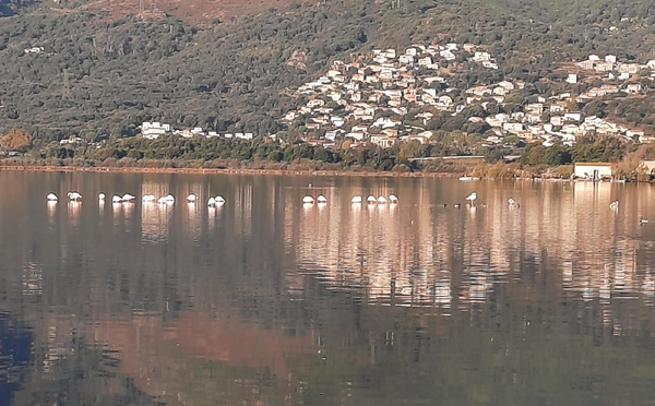 Dans le calme du matin, l’étang de Chjurlinu devient un miroir parfait où se reflète Boguglia, blotti au pied des massifs qui dominent la région. La lumière douce éclaire les maisons accrochées à la montagne et les silhouettes des flamants roses glissant sur...