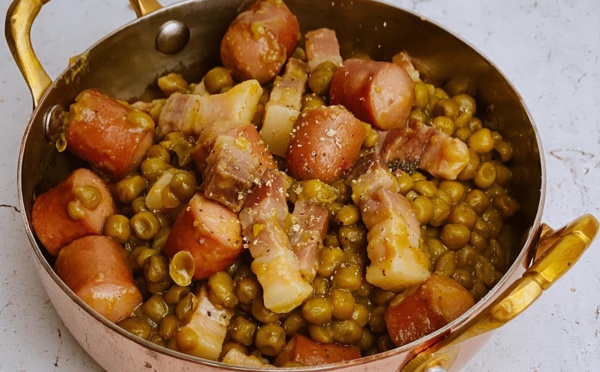 A table : Petits pois panzetta et saucissettes avec #lapetitecuisinedemarie