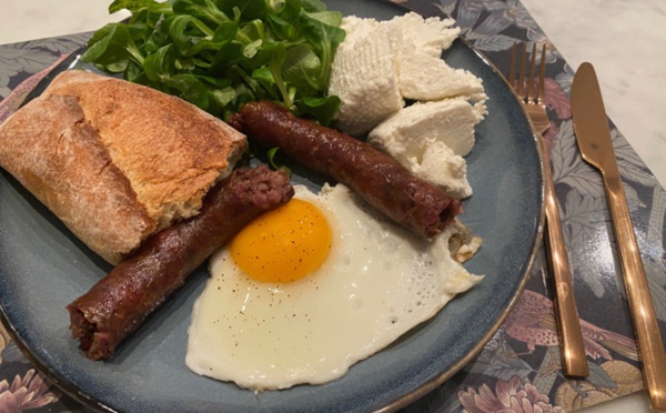 A table : Figatellu, brocciu frais, œufs, pulenda avec #lapetitecuisinedemarie