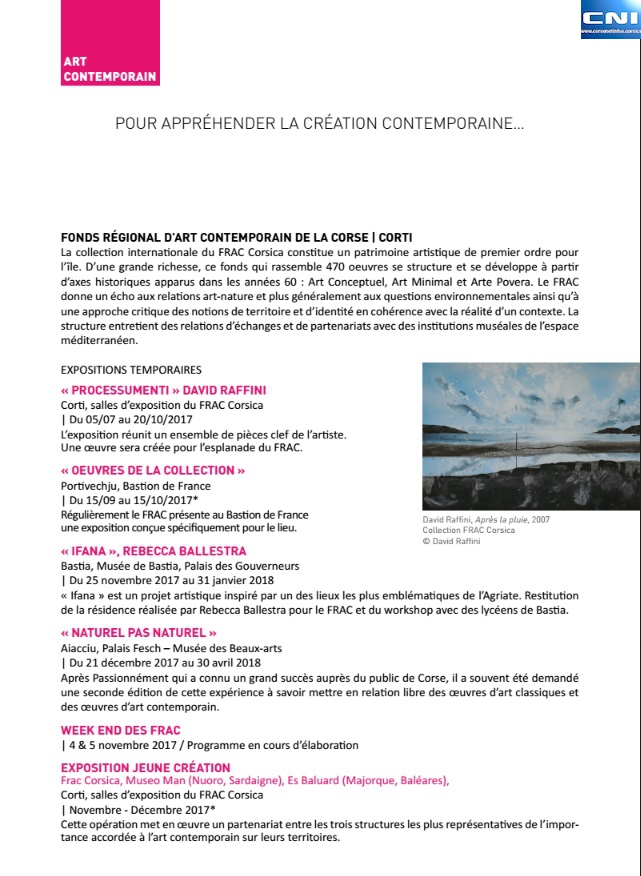 • À Corti, dans les salles du Fonds régional d’art contemporain, on pourra découvrir les œuvres d’une des valeurs montantes de l’art contemporain, David Raffini.