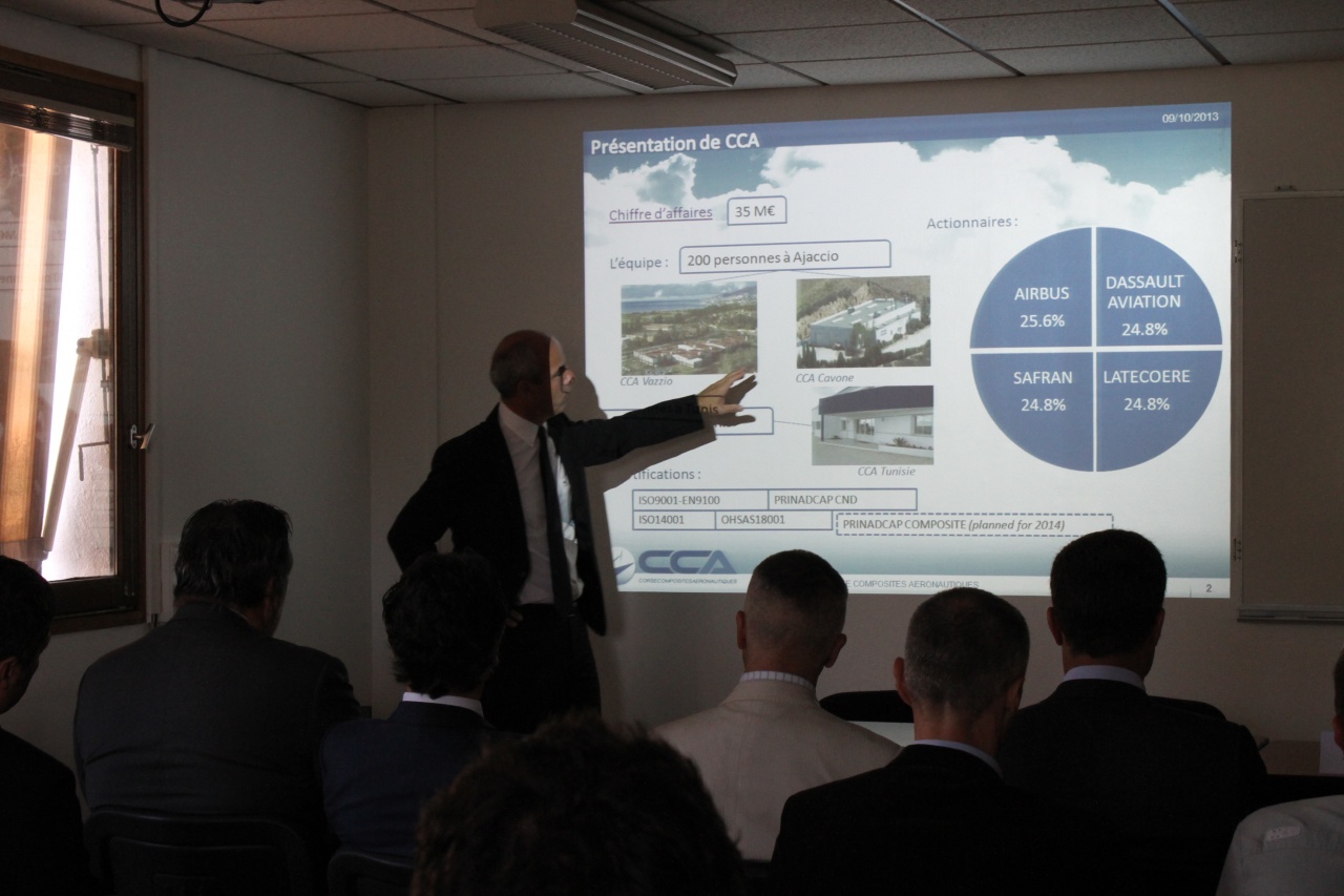 Avant la visite du site, Jean-Yves Leccia, directeur de l’entreprise, a fait une présentation de Corse Composites Aéronautique. Une entreprise de 35 millions d’euros de chiffre d’affaire, avec une augmentation de 50% prévue sur les 4 années à venir.