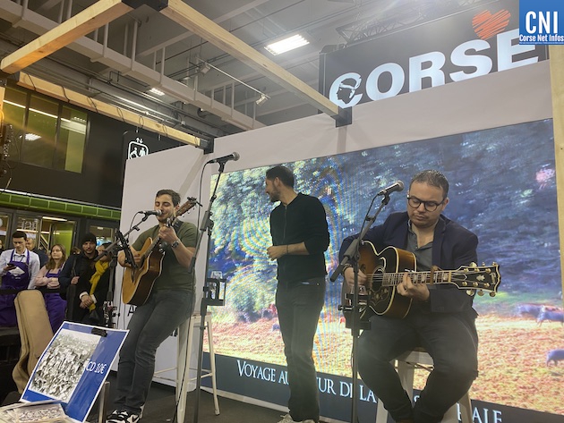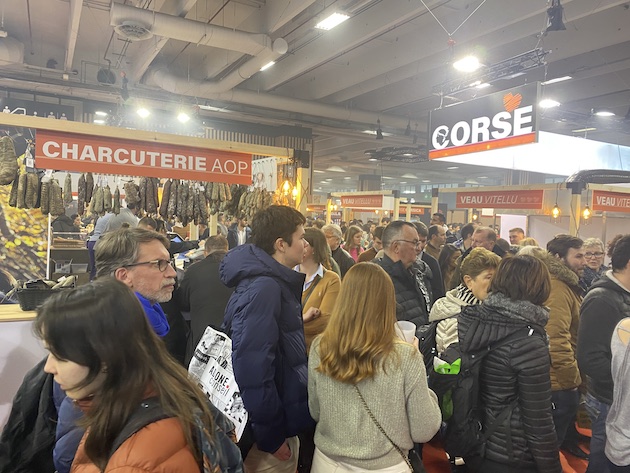 Ce dimanche 26 février, le village corse porte bien son nom. Comme une place de village lors d'un bal d'été, Corses venus exprès pour l'évènement, diaspora et continentaux se rassemblent autour d'un verre de vin, d'une assiette de charcuterie et d'un sandwich au veau en dansant sur le célèbre titre « Mi ne vogu » joué par le groupe Boca di ghjuventù. C'est d'ailleurs pour l'ambiance festive et conviviale qu'un groupe d'amis du Sud-Ouest habitué du salon ne loupe jamais le village corse. « Ici on sait qu'il y a toujours du bon vin, de la musique, de la bonne charcuterie... c'est une valeur sûre ! », lancent Lucas et Paul, 25 ans en attendant leur tour pour les côtelettes d'agneau de lait.