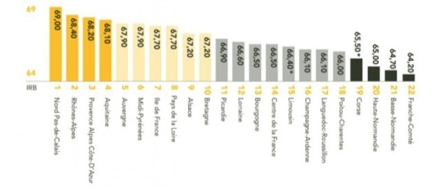 Dans ce palmarès, c'est la région Nord Pas-De-Calais qui arrive en tête (avec 69 points), suivi de près par la région Rhône-Alpes (68,40 points), la Provence Alpes Côte-d'Azur (68,20) et l'Aquitaine, (68,10).