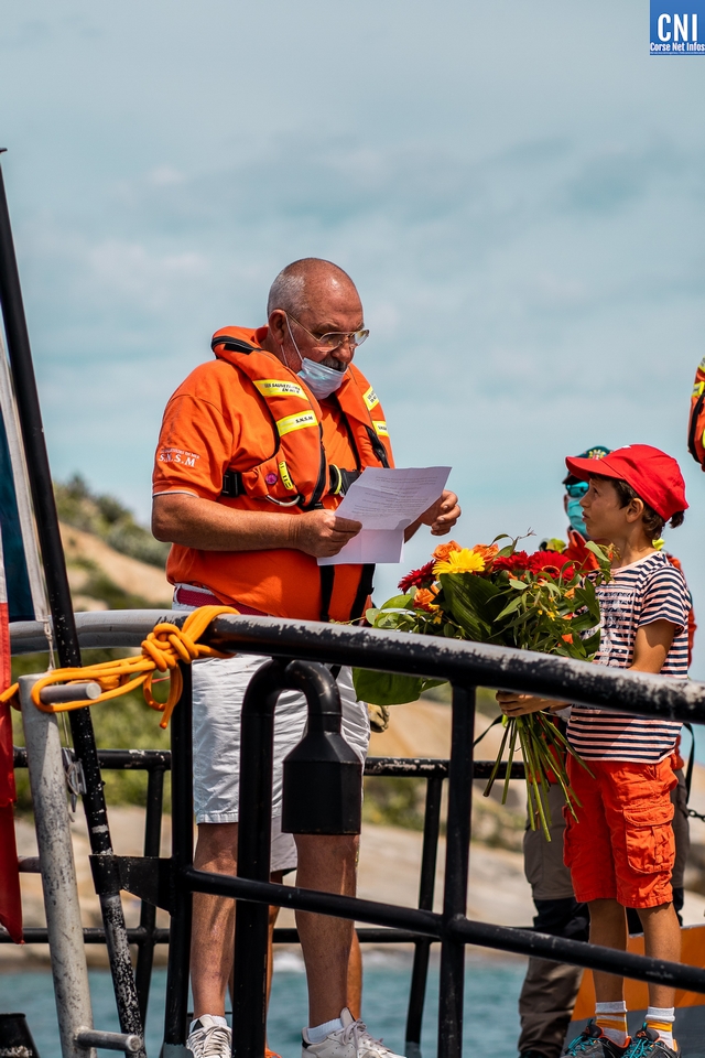 C'est le tout jeune Gabriel qui au nom de la grande famille de la SNSM Calvi-Balagne et pour le repos éternel de leurs camarades disparus lançait un bouquet de fleurs à la mer alors que comme partout en France la corne de brume sonnait.
