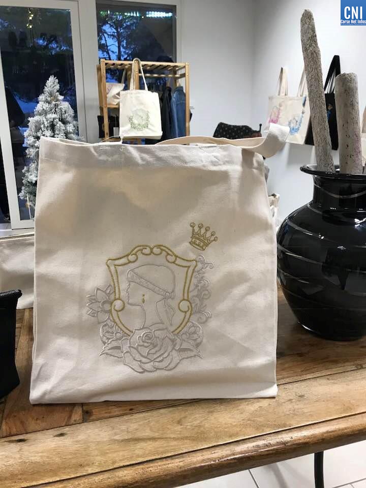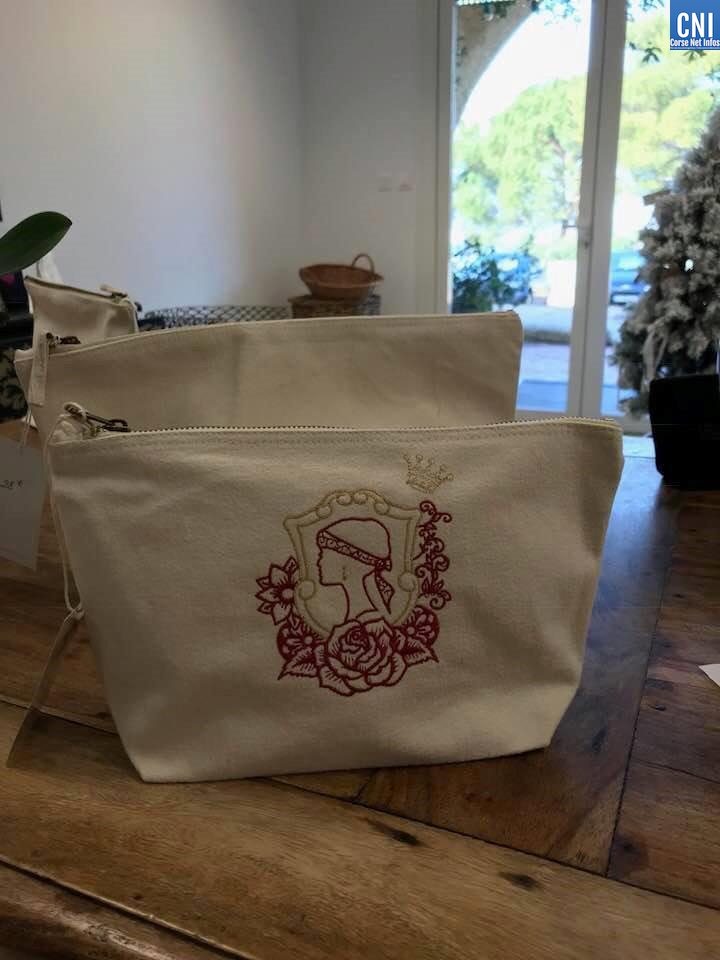 Sur ses créations, Christiane n’écrit qu’en corse. Pour Noël, elle a fabriqué des modèles de sacs et de pochettes avec les inscriptions « A me fiola d’amore », ou « à ma mamma carra», de quoi donner de belles idées de cadeaux.