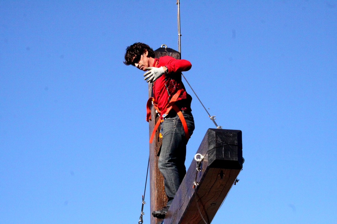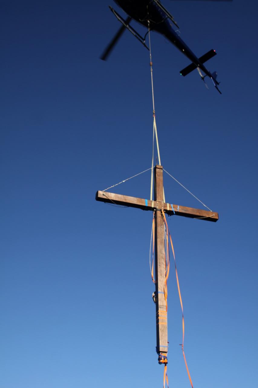La croix de 7 mètres de haut pour un bois total de 400 kg , réalisée à Voralberg en Autriche a été déposée par un groupe d’une vingtaine d’hommes, en un temps record de 2 heures et 15 minutes et montée sur place.