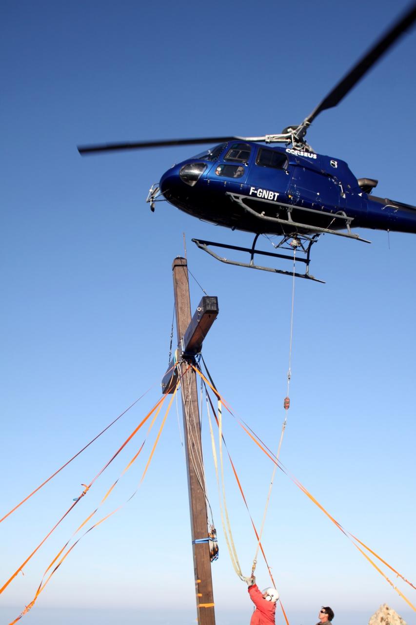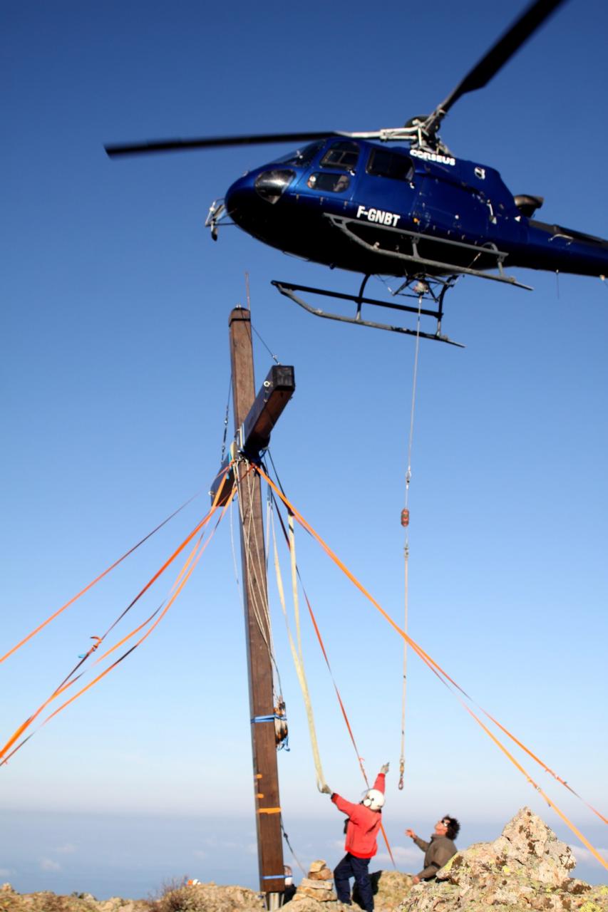 Gilbert Giacometti, aux commandes de l’hélicoptère se présentait au-dessus du piton rocheux, la lourde croix de 8 m de long pour 5 mètres d’envergure et un poids total de 830 kg, suspendue à sa machine. Guidé au sol, tel un métronome, il réussissait en quelques minutes à poser la croix dans son socle, avant de décrocher. Au sol, l’équipe fixait les sangles provisoires, en attendant de fixer le câblage en acier.