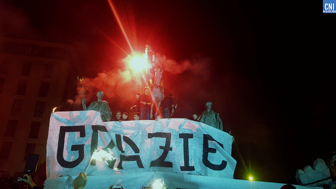 Il faut dire que la fête était belle, avec un final digne d'un avant réveillon. Ce dimanche soir on a chanté, dansé, investi la statue de Napoléon et de ses frères, illuminé la place du diamant avec des fumigènes donnant à celle-ci la couleur rouge que la ville d'Ajaccio affectionne particulièrement.