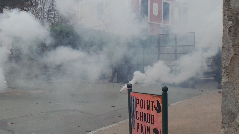 Puis la tension monta d'un cran. Avec d'un côté des barrages composés de pallettes en bois et de pneus qui s'embrasaient devant gendarmes mobiles et CRS. Puis le jet de quelques cocktail Molotov. Et de l'autre des tirs de grenades lacrymogènes.