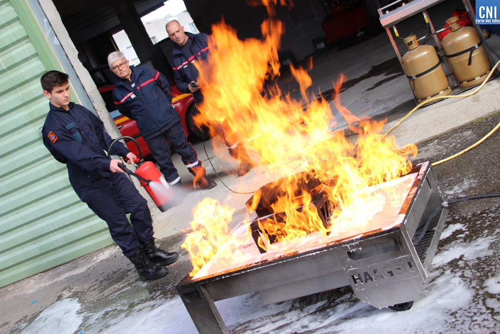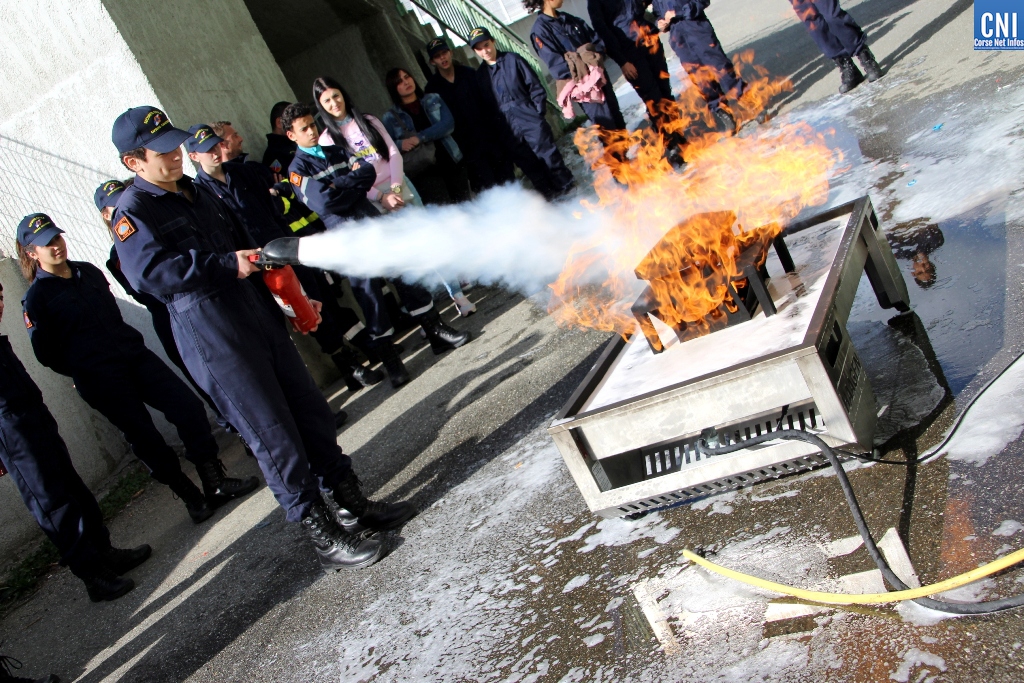 De retour à l’école de formation des pompiers de Haute-Corse, les jeunes apprenant(e)s devaient s’accoutumer notamment avec l’utilisation des extincteurs à eau avec additif et ceux contenant du gaz carbonique.