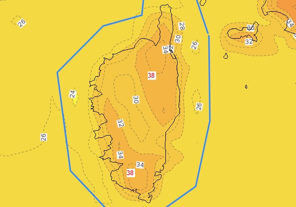 Dans un courant de Sud-est, le temps sera le plus souvent bien ensoleillé. Quelques passages nuageux sont toutefois possibles dans l’après midi le long de la côte orientale où le vent de Sud-est soufflera assez fort. Températures maximales en hausse : 29 à 32 degrés en bord de mer, jusqu’à 38 degrés dans le Cortenais et le Sartenais.