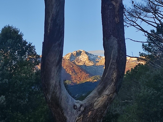 Première neige sur le Renosu vue depuis le vieux pin fourchu ce 8 novembre (Alain Pieri)