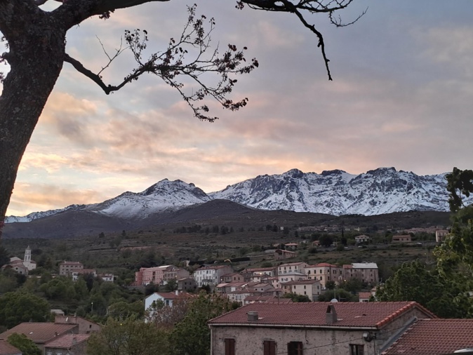Coucher de soleil sur les cimes enneigées au-dessus de Calacuccia. (Christine Le Hir)