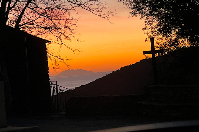 Un balcon sur la mer, une vue imprenable sur l'île d'Elbe à l'heure où le soleil paresse toujours derrière l'archipel toscan et cette croix qui se détache du paysage en attendant la clarté du jour : les petits matins en Corse comme ici à quelques kilomètres à peine au nord de Bastia ne manquent guère de charmes à cette période de l'année.