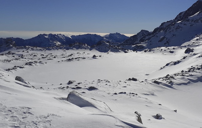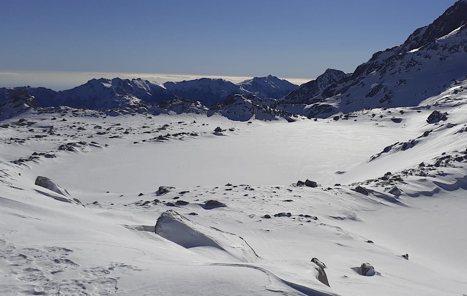Antoine Lozano, à la faveur d'une balade que seuls des spécialistes de la montagne peuvent pratiquer actuellement, a fixé cette belle image du lac de Bastani qui culmine à plus de 2 000 mètres d'altitude face au Monte Renosu.