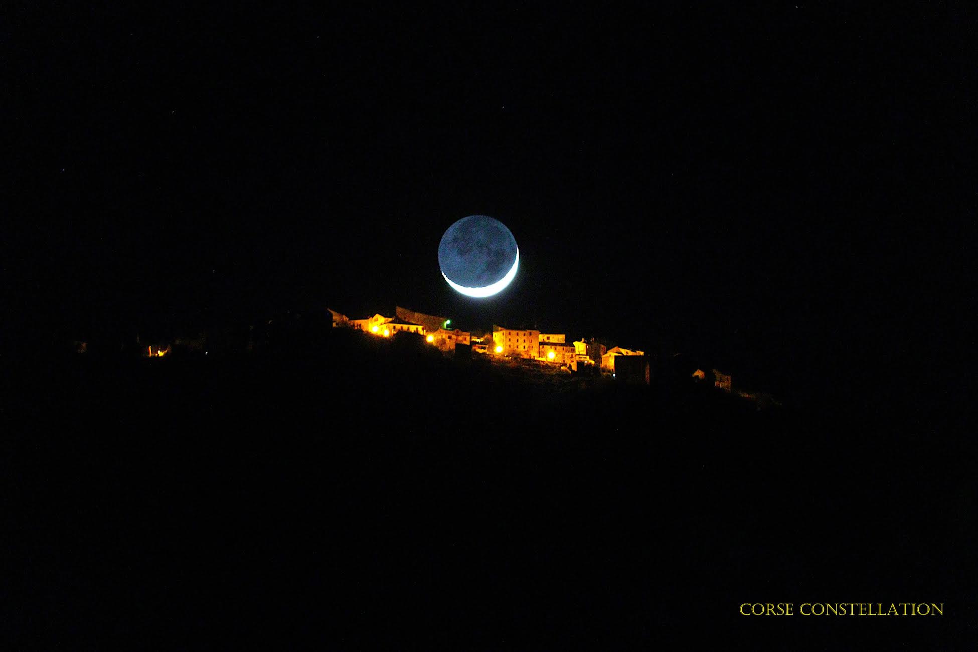 Lorsque la lumière d'un fin croissant de Lune, vient s'opposer à celle du village de Prunelli di Fium'Orbu, cela permet à Alexandre Germani de Corse constellation de réaliser depuis l'observatoire d'Abbazia une telle image.