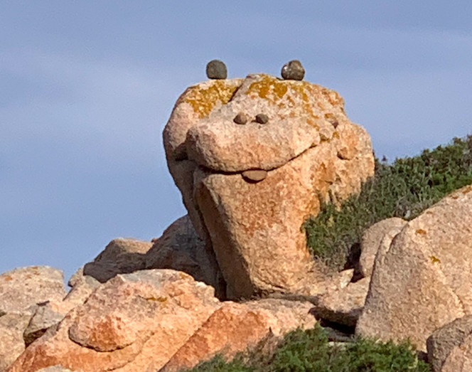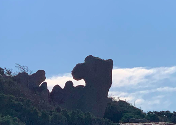 Les randonnées sur le littoral donnent, parfois, l'occasion de faire de bien étranges découvertes. Tel est le cas sur le chemin longeant la grande bleue entre La Tonnara et le phare de Capu di Fenu; Le travail de dame nature sur le long terme a fait son oeuvre sculptant les rochers et si l'on ajoute à cela une luminosité particulière mais, aussi, la main de l'homme on obtient un véritable bestiaire à l'image de cette tête de serpent ou bien de ce chameau ou dromadaire semblant se reposer à proximité de Capu di Fenu.