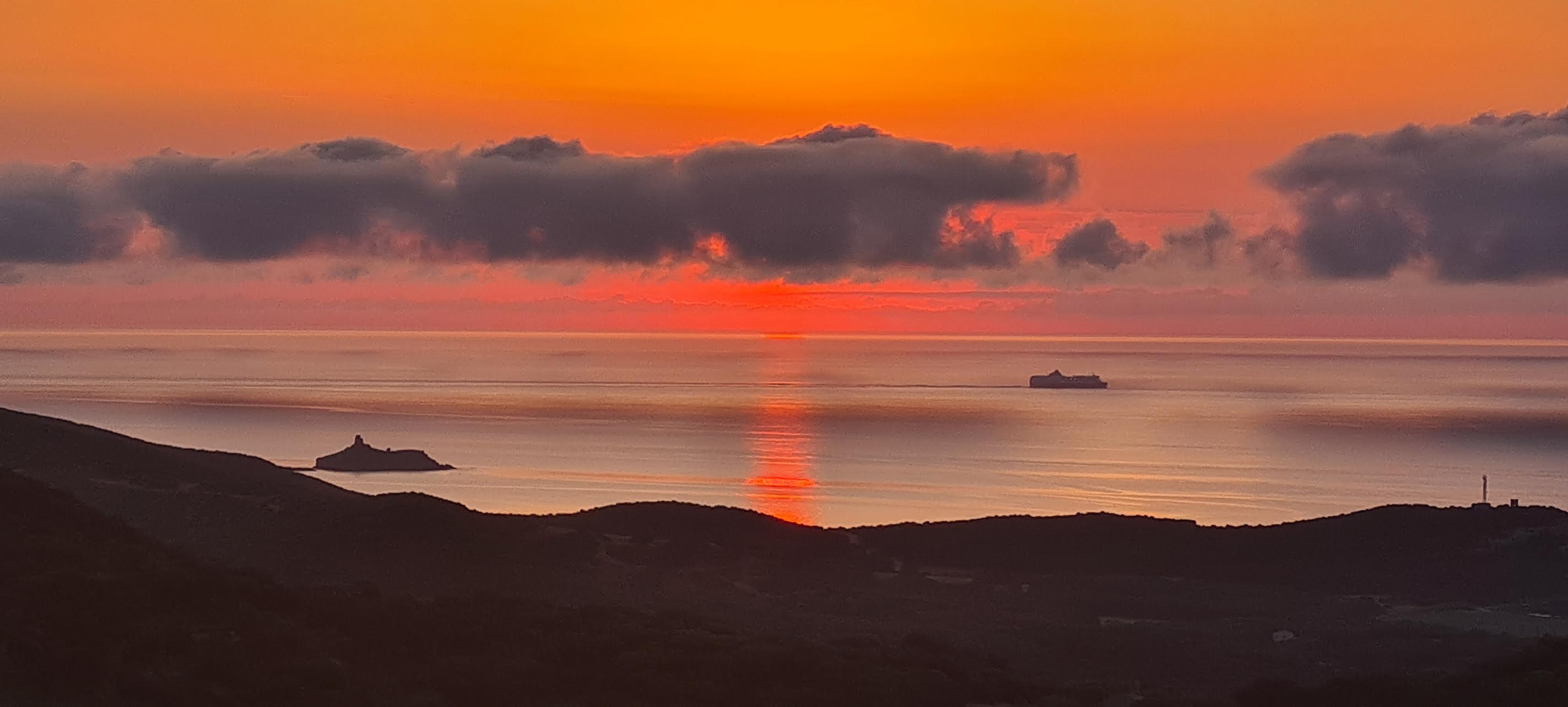 Lorsque le soleil se détache à l'horizon de l'archipel toscan, le spectacle offert par Dame Nature, comme ici au-dessus des îles de Finocchiarola, tout au bout du Cap Corse, à l'heure où les bateaux parent au large, est d'une beauté exceptionnelle.